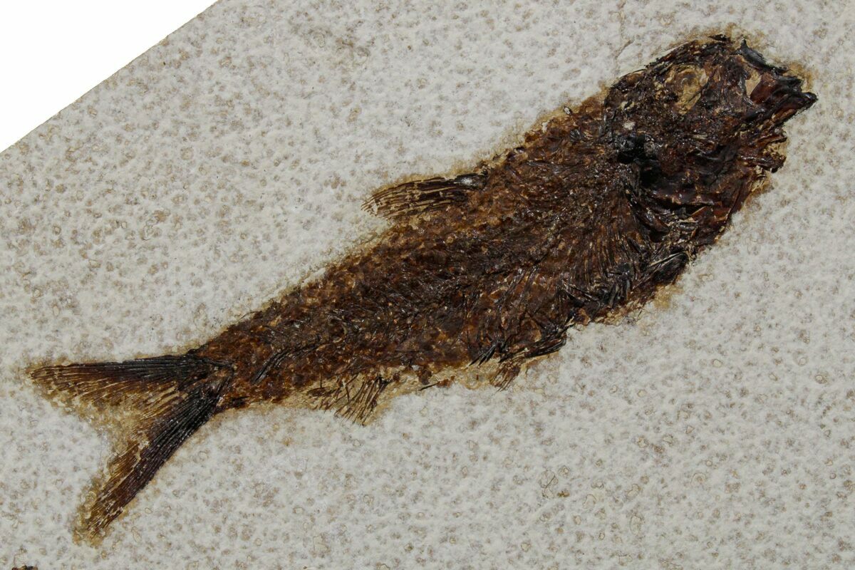 Specimens like this come from the coveted 18 inch layer of the Green River Formation, which produces darker and more detailed fish than the majority on the market. The rock from this layer is much harder and more durable than other layers in the formation, likely due to its initial deposition conditions in deep water. Because of these conditions, fish found in the 18-inch layer can be extracted whole and in excellent condition. This layer is typically collected at night using low-angle light to see the bump in the rock that the fish's backbone creates. They then cut these fish out and take them to a lab where the fish, which may be up to an inch under the surface of the rock, are meticulously extracted under microscope with hand tools.