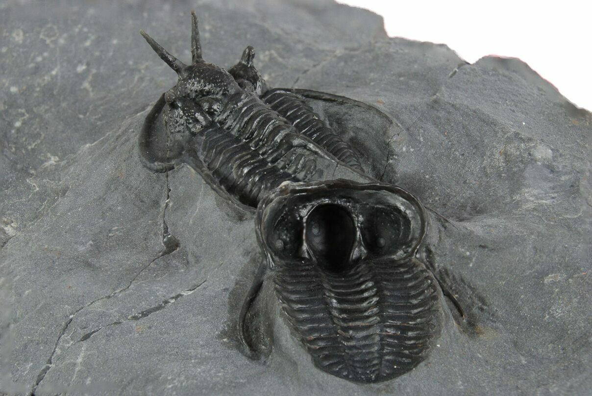 This is a nice pair of Cyphaspis walteri trilobites from the Bou Dib Formation near Mrakib, Morocco. This species is sometimes referred to as the "Devil Horn" Cyphaspis for obvious reasons. The larger, dorsal specimen is 1.3" long while the smaller, ventral specimen is .8" long. There is no restoration on this piece.