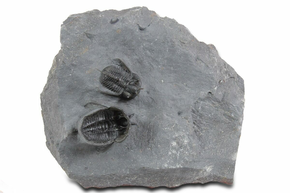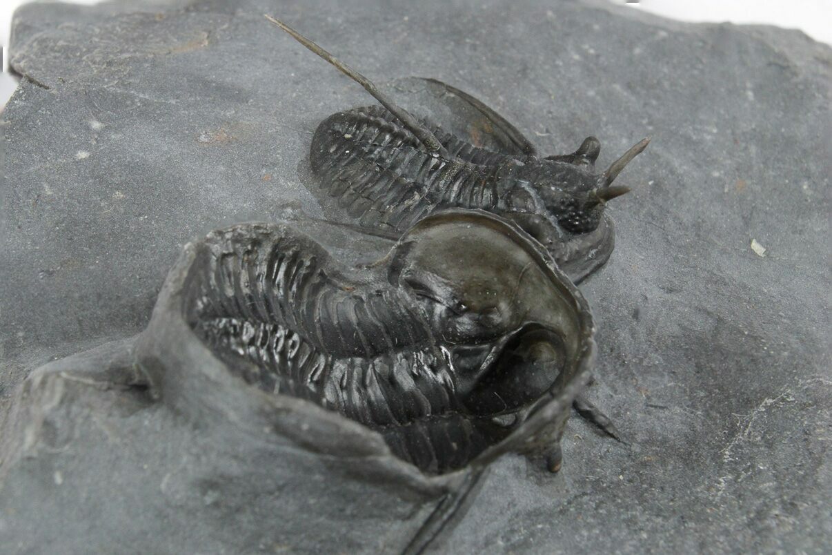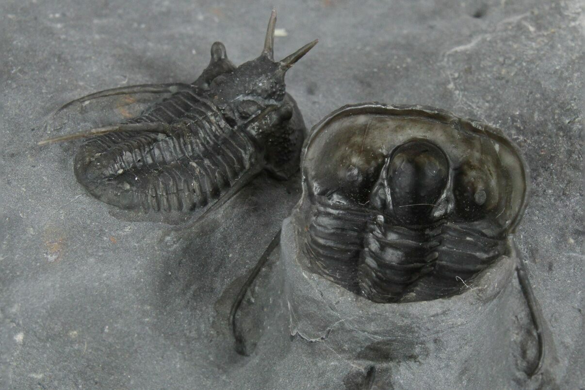 This is a nice pair of Cyphaspis walteri trilobites from the Bou Dib Formation near Mrakib, Morocco. This species is sometimes referred to as the "Devil Horn" Cyphaspis for obvious reasons. The smaller, dorsal specimen is .9" long while the larger, ventral specimen is 1" long. There is no restoration on this piece.