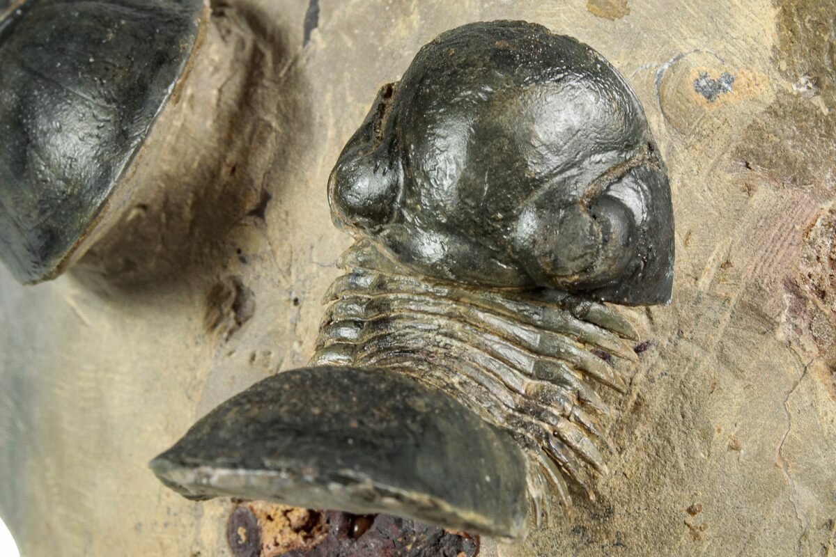 The smaller specimen’s right cheek is either a composite or was repositioned during preparation, but otherwise there is no restoration. A striking and beautifully prepared dual-trilobite display.