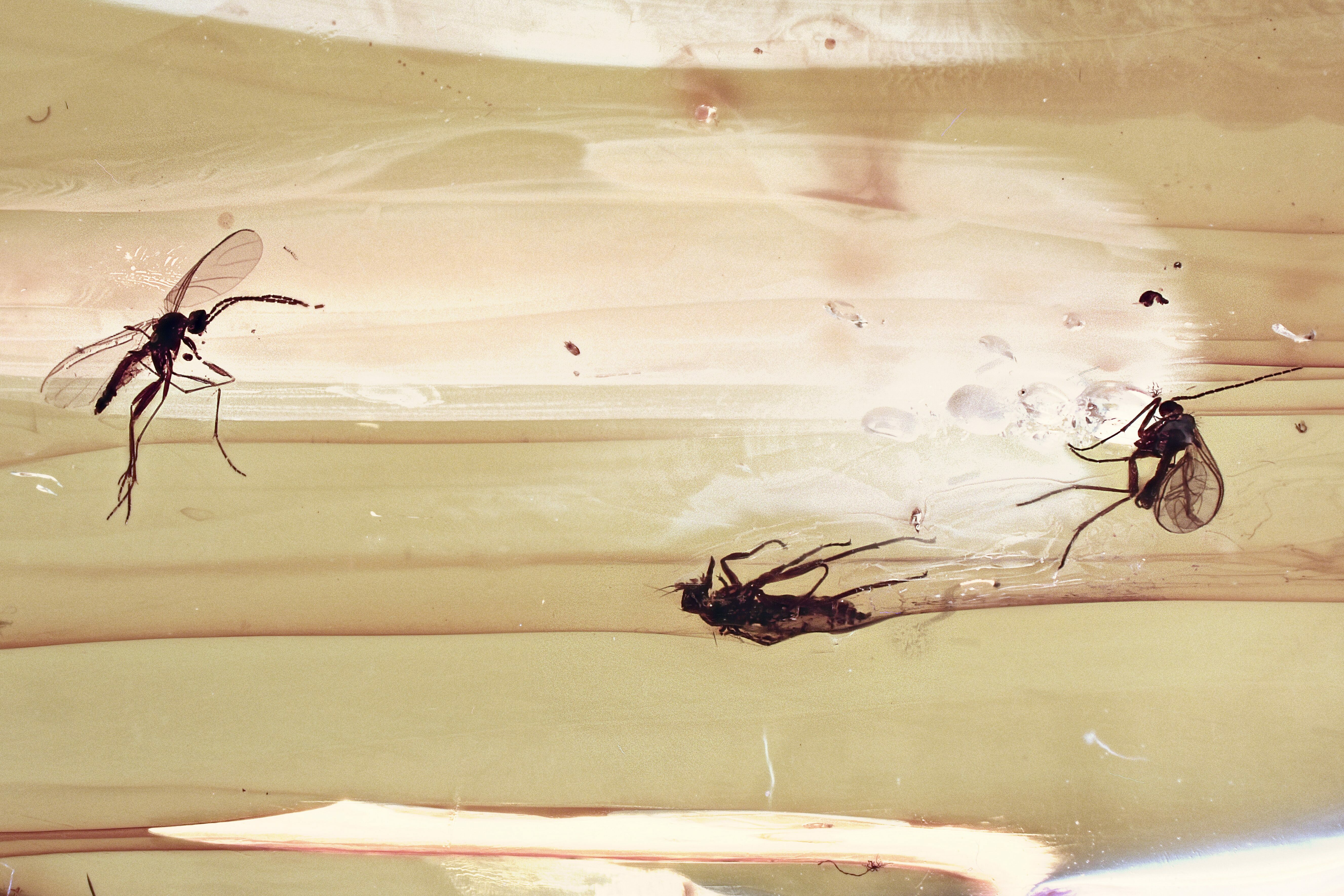 This is a cluster of two 44 million year old fossil dagger flies (family Empididae), preserved alongside a dark-winged fungus gnat (family Sciaridae) within Baltic amber. The flies/gnat range from about 2mm to 3mm wide including appendages.