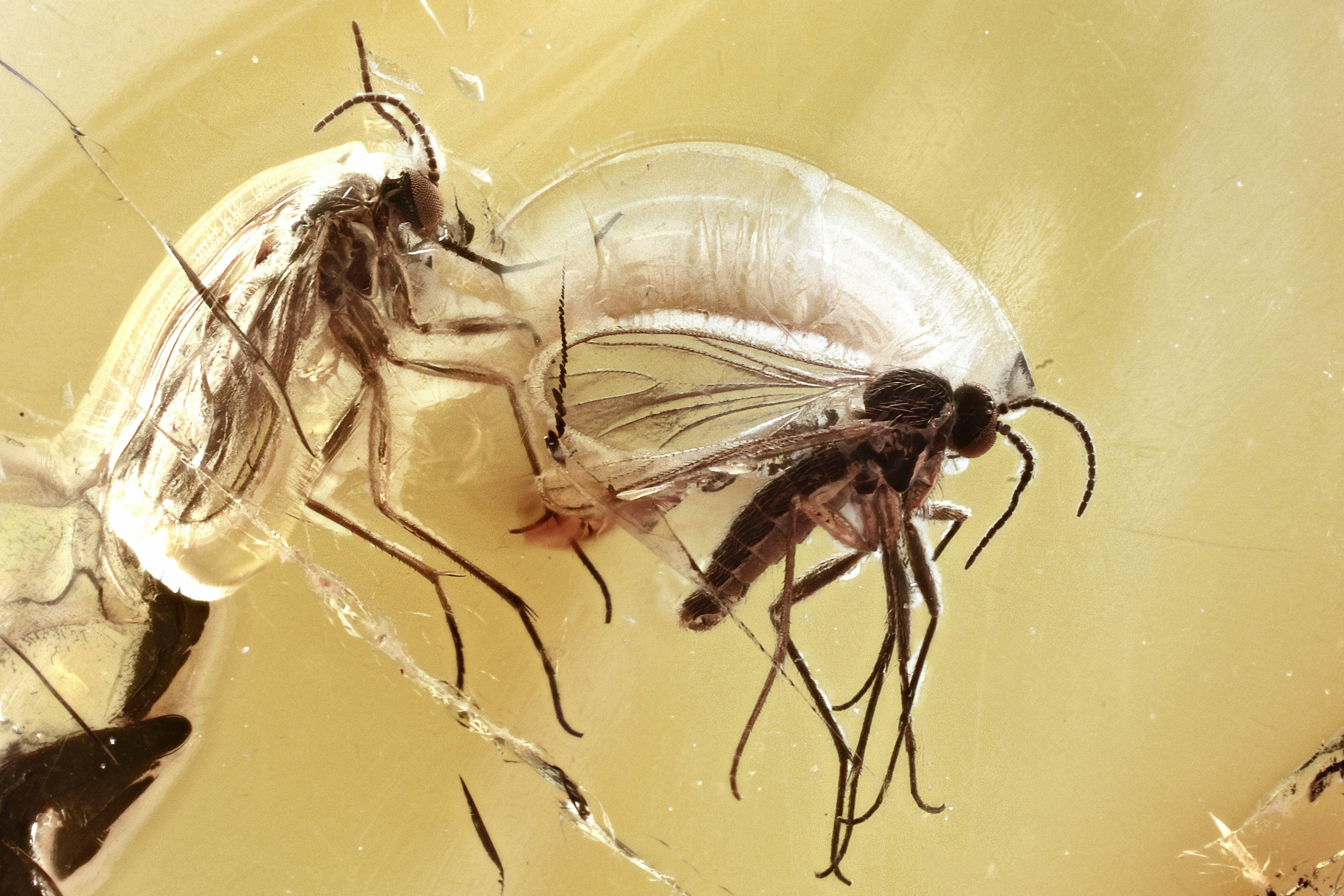 These are nicely detailed, 44 million year old fossil dark-winged fungus gnats (order Diptera - family Sciaridae) preserved in Baltic amber.