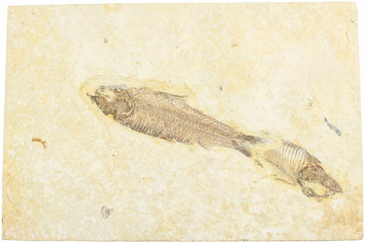 This is a decently preserved plate of two Knightia eocaena, collected from Warfield fossil quarry near Kemmerer, Wyoming. The longer of the two measures 3.6" long and the smaller, partial specimen is about 1.6" inches long. The preparation of this piece is simple but quite nice.