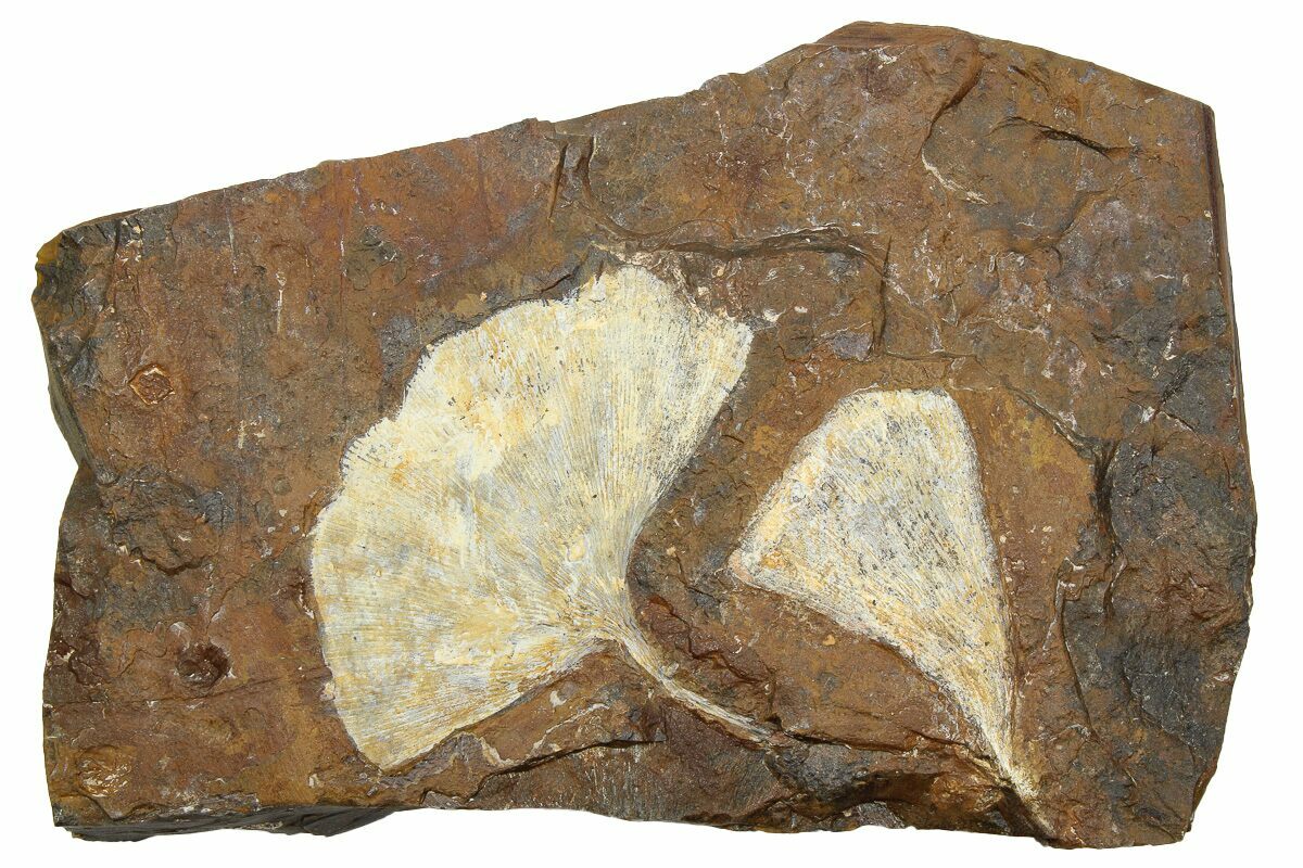 This is a beautiful association of two fossil ginkgo leaves (Ginkgo cranei) from the Sentinel Butte Formation of North Dakota. They are finely detailed and the light preservation contrasts well against the dark orangish-brown rock. The rock also contains impressions of unidentified broadleaf leaves on the reverse side.