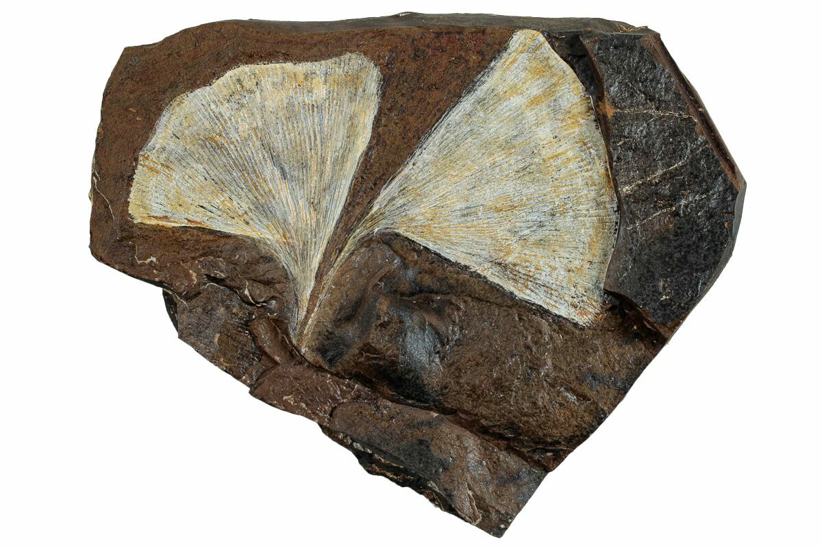 This is a association of two fossil ginkgo leaves (Ginkgo cranei) from the Sentinel Butte Formation of North Dakota. They are finely detailed and the light preservation contrasts well against the dark orangish-brown rock. The reverse side also has several detailed ginkgo impressions.