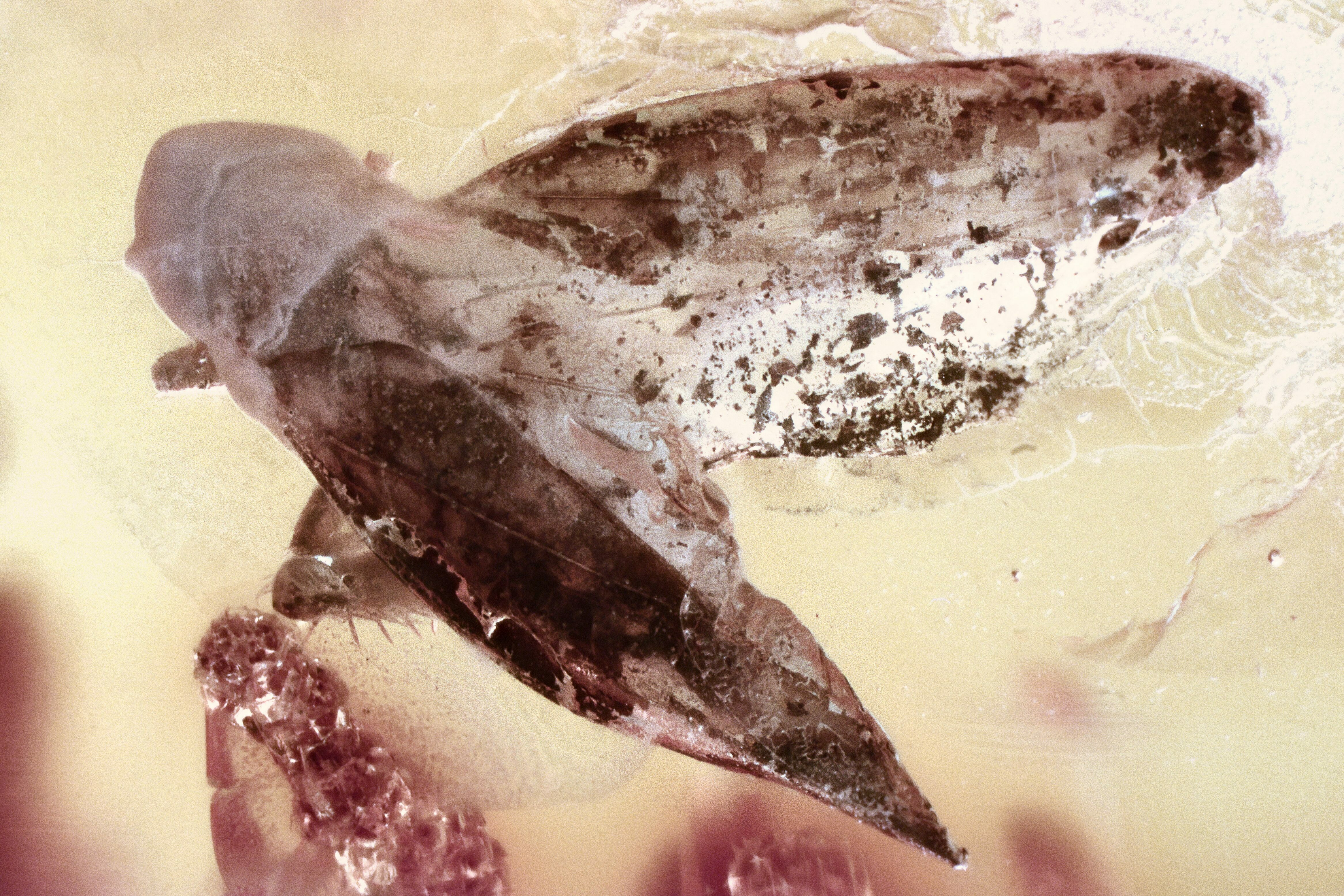 These are two detailed, 44 million year old fossil leafhoppers (family Cicadellidae) preserved in Baltic amber. The body length of the largest leafhopper is approximately 2.5mm.