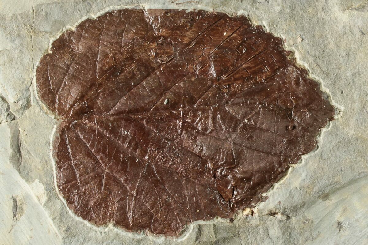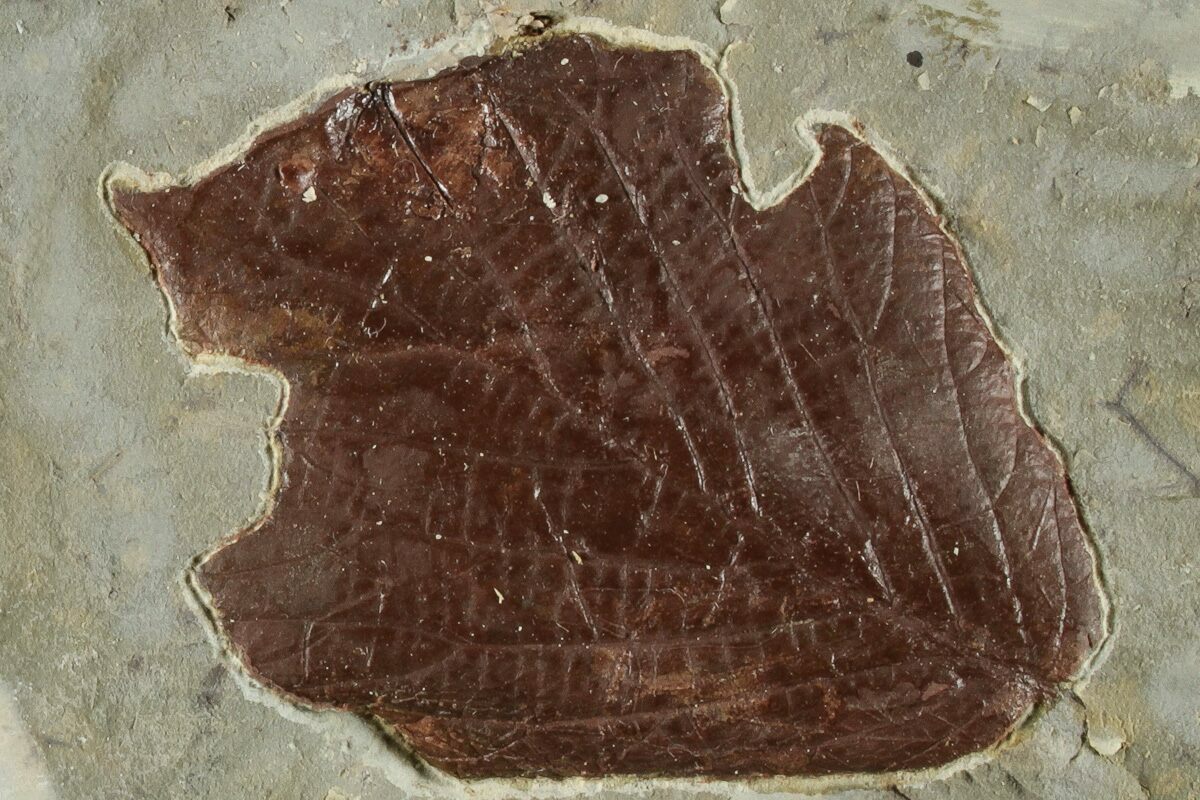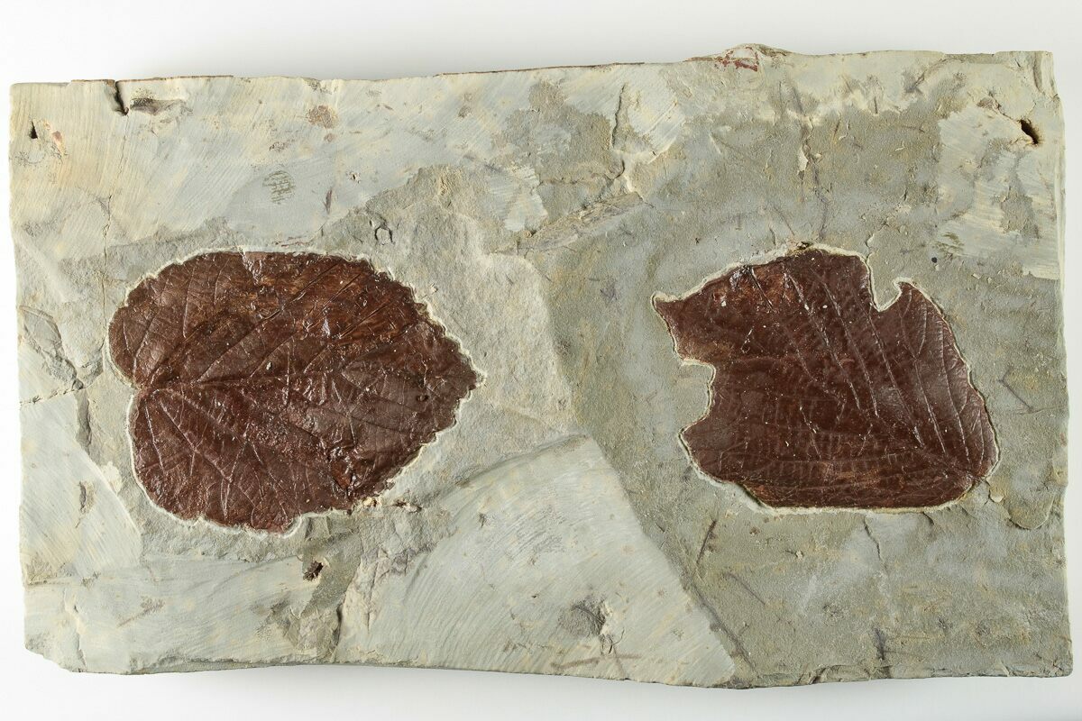 This is an association of two fossil leaves both of the species Beringiaphyllum cupanoides. These leaves were collected from the Fort Union Formation near Glendive, Montana. The dark orange/brown preservation contrasts well against the shale, and many of the details in the leaf can be seen in good relief. There are some touchups to the surface of the leaf where some of it flaked onto the negative during collection. One of the leaves has undergone aggressive insect predation prior to fossilization.