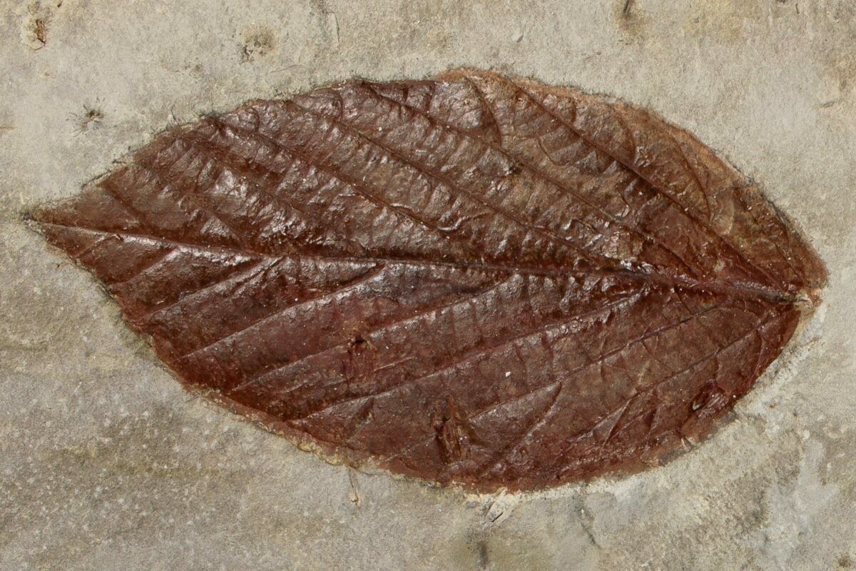 These are two fossil leaves (Zizyphoides flabellum and unidentified) from the Fort Union Formation near Glendive, Montana. The unknown leaf is 3" long and the Zizyphoides leaf is 3.2" long. The dark orange/brown preservation contrasts well against the shale, and many of the details in the leaves can be seen in good relief. There may be some touchups to the surface of the leaves where pieces of them flaked onto the negative during collection.
