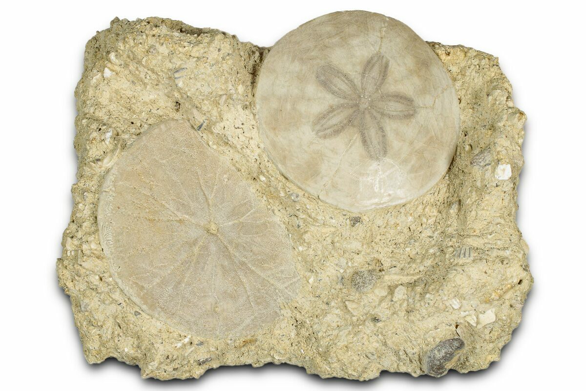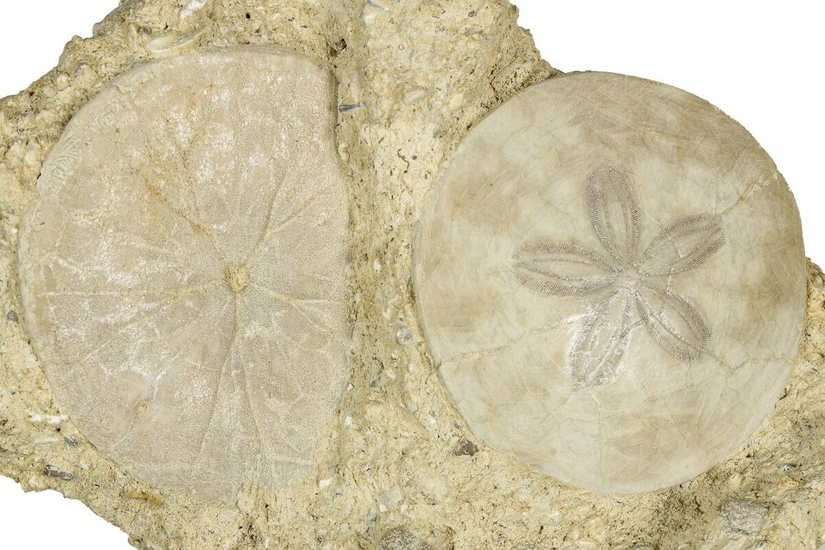 This is a truly beautiful specimen with two fossil sand dollars of the genus/species Scutella faujasii. They were collected in the D'Angers Region of France and are Early Miocene in age. The larger of the two measures 2.45" wide.