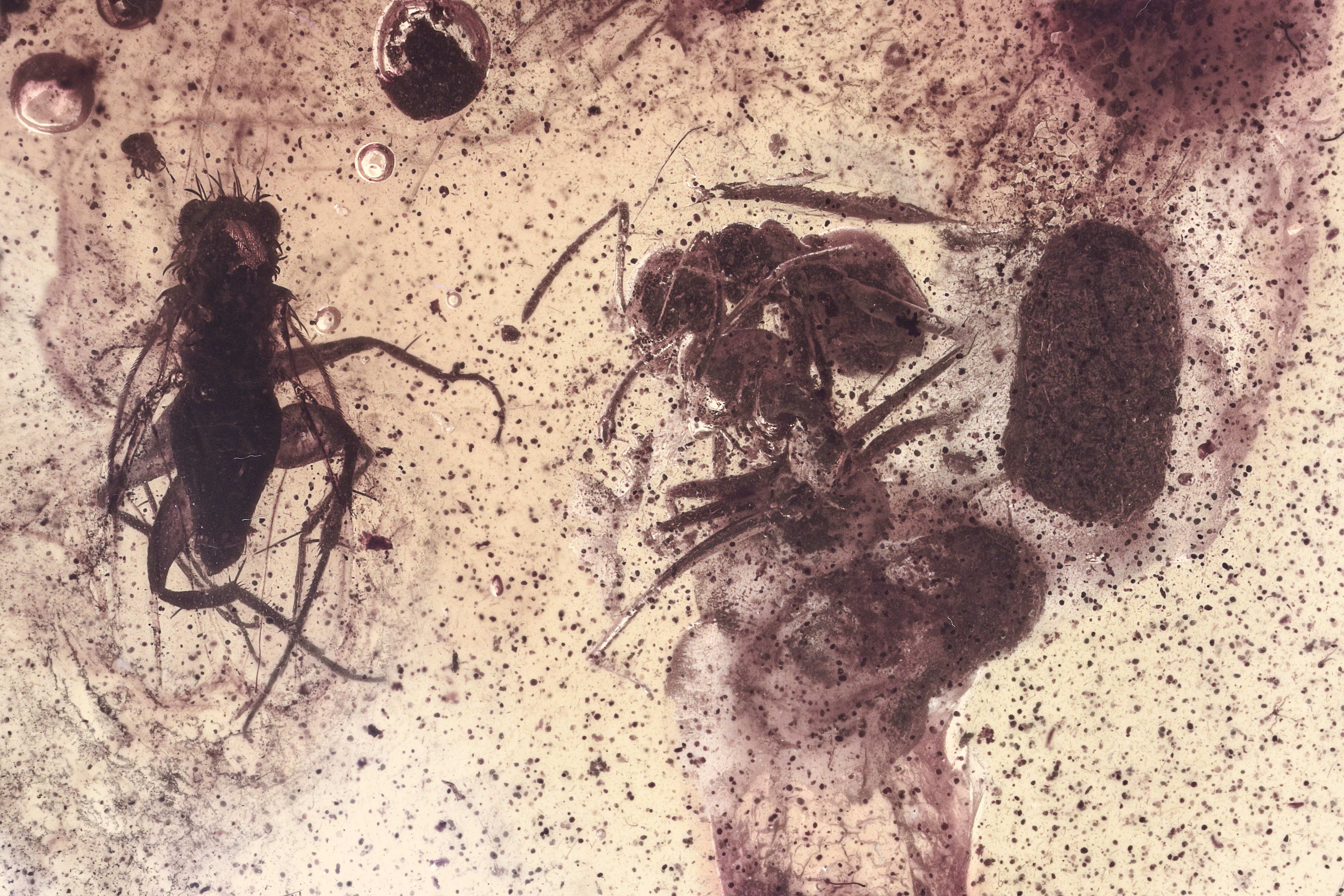 This is a beautifully detailed 44 million year old cluster of two fossil scuttle flies (order Diptera - family Phoridae), two ants (order Hymenoptera - family Formicidae), and a coprolite (fossil poop) preserved in Baltic amber.