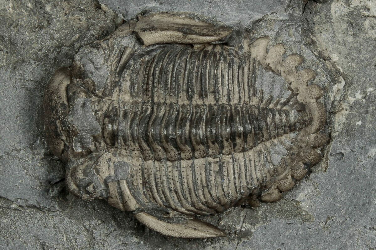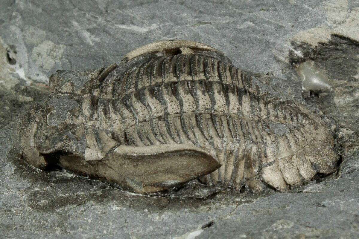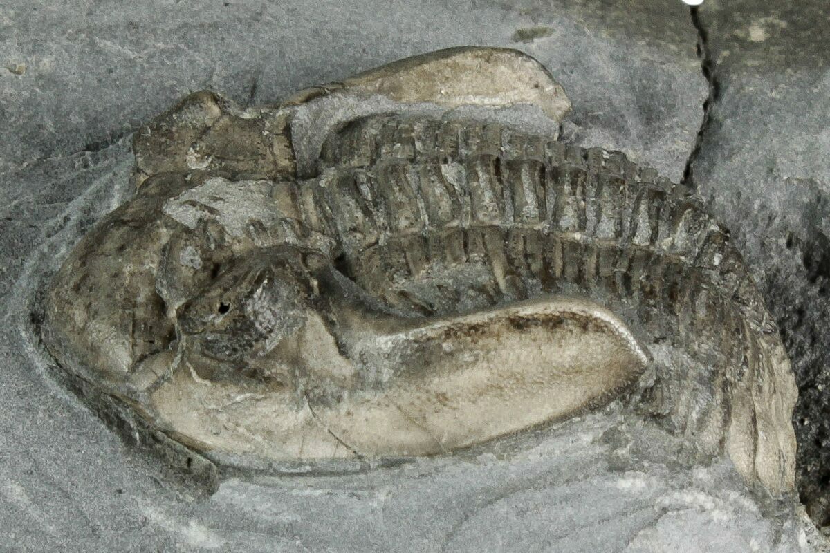 There is some restoration to the cephalon of the largest trilobite where the shale split through the right genal spine.