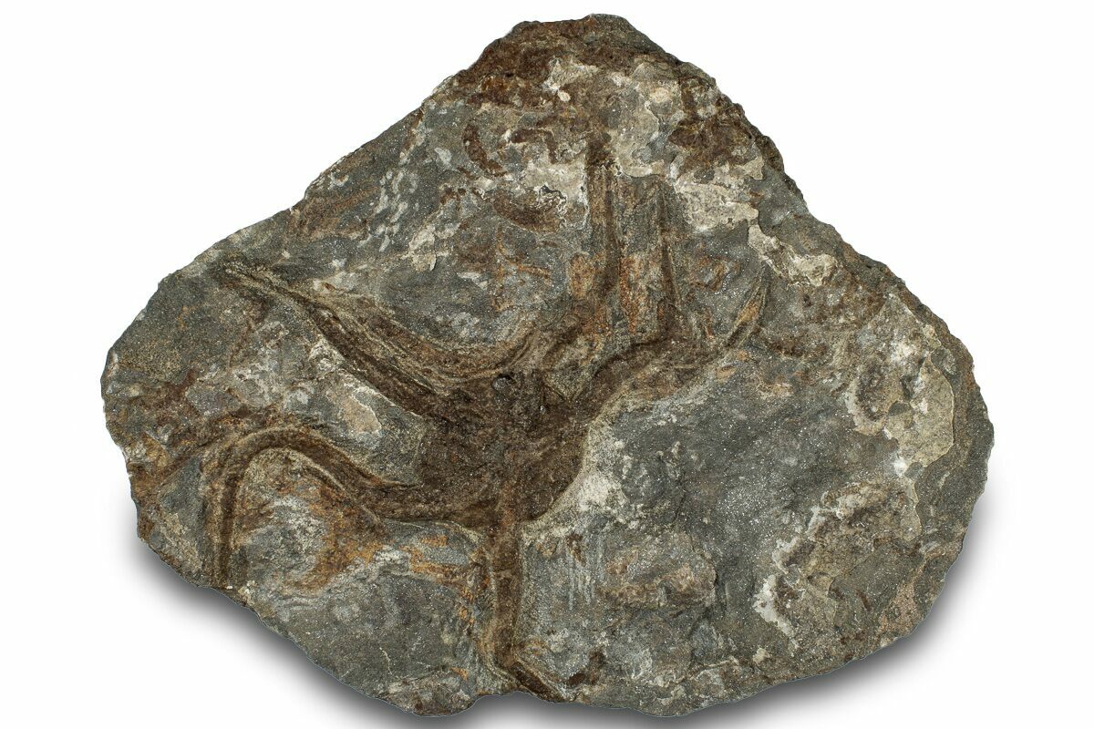 This plate features two fossil brittle stars (Ophiura sp.) from the Kataoua Formation of Morocco. They are Ordovician in age, or approximately 450 million years old. The largest brittle star is 5.9" wide.