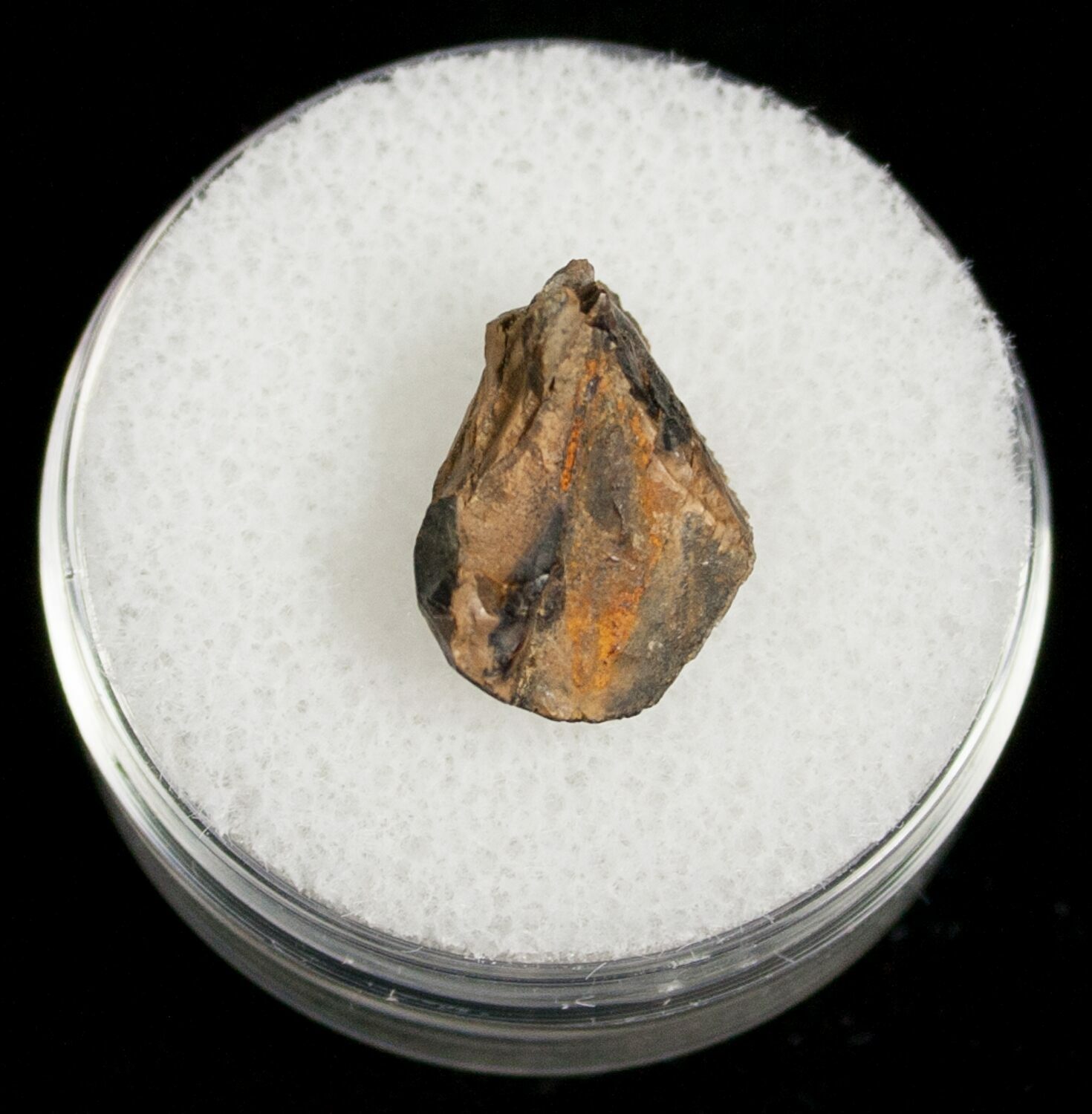 This is a Tyrannosaurid tooth tip with good serrations running along the side. It comes from a private dig on the Hell Creek Formation of Montana. It has very nice enamel preservation. Complete T-Rex teeth often run into the thousands of dollars so here's a chance to own part of an authentic one for a tiny fraction of that. It comes in the pictured jewel case.