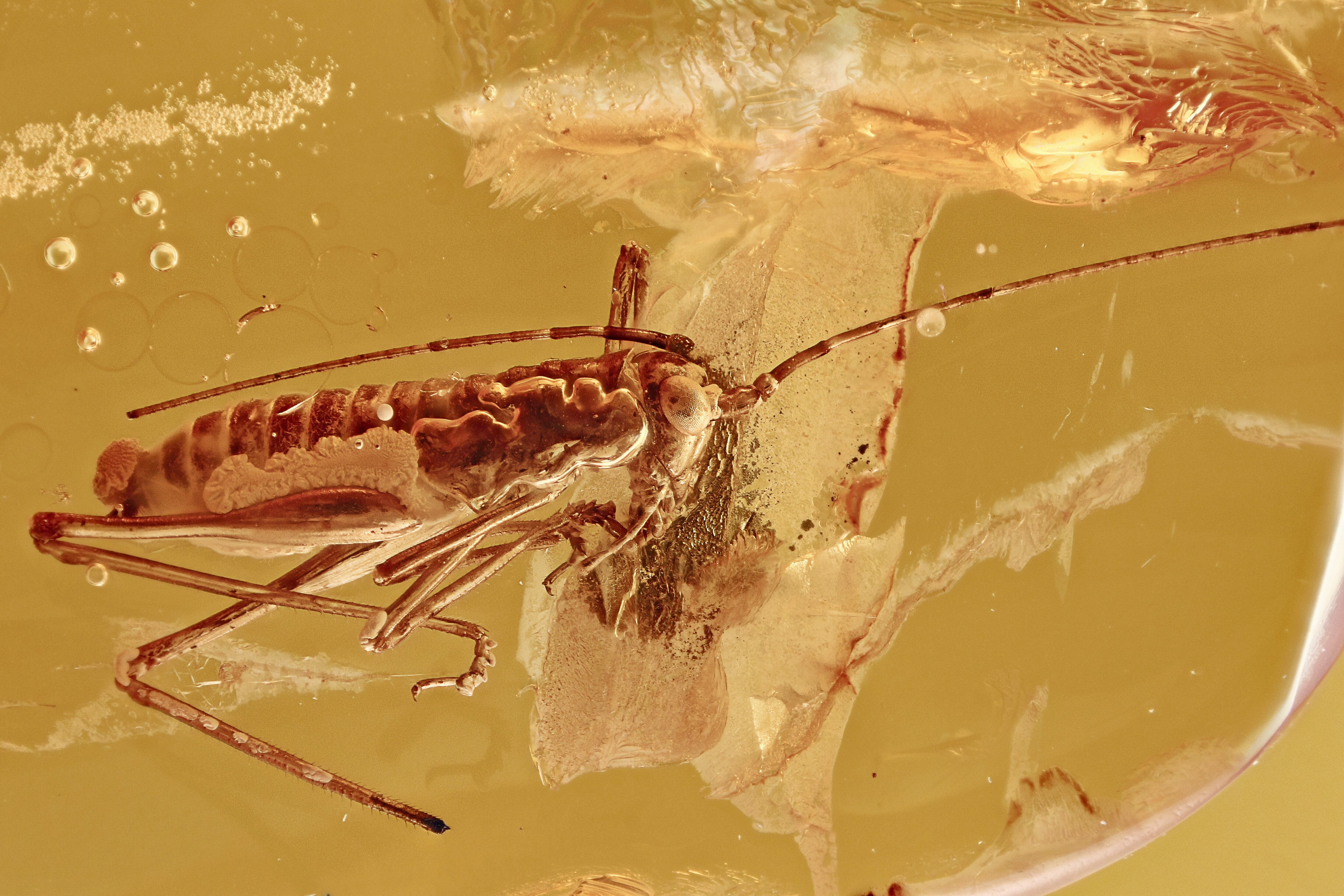 This is a relatively large and beautifully detailed 44 million year old fossil cricket (family Gryllidae) preserved in Baltic amber. The length of the cricket is about 12.6mm including antennae and appendages.