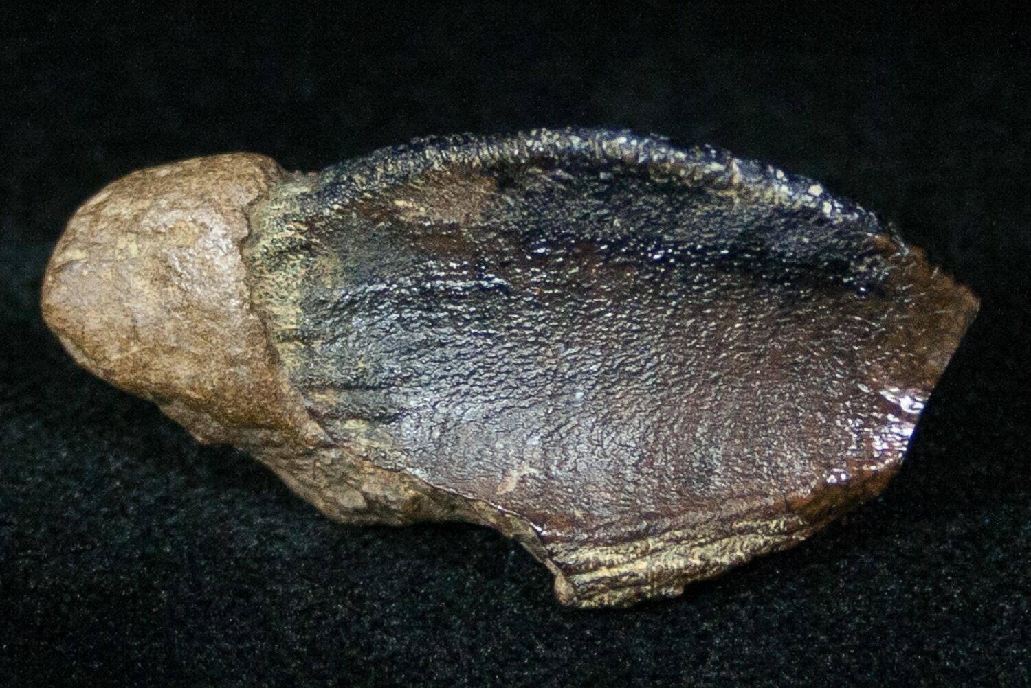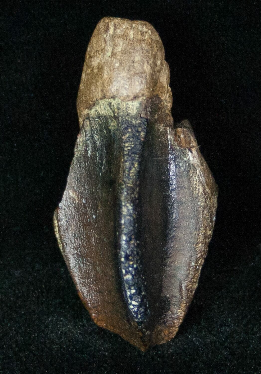 This is a very large, 1.61" long tooth of the iconic, horned dinosaur, Triceratops horridus. It was collected from the Hell Creek Formation of Power River County, Montana. This tooth has relatively little wear and is not a shed tooth like most Triceratops teeth that are found. Part of one root is still attached.