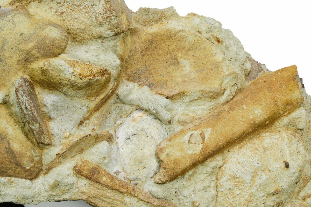 This specimen is good-sized at 5.01" long and still maintains its sharp serrations. It was left embedded in the sandstone in which it was found which is filled with the bones of marine mammals like Sea Lions or whales. The entire piece measures 10.5 x 5.2 x 3.5" and it comes with a display stand.