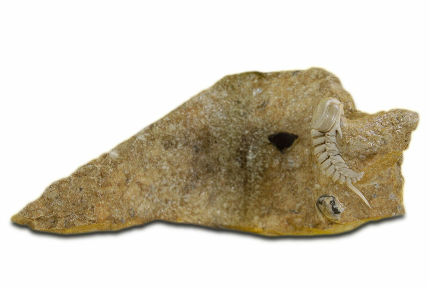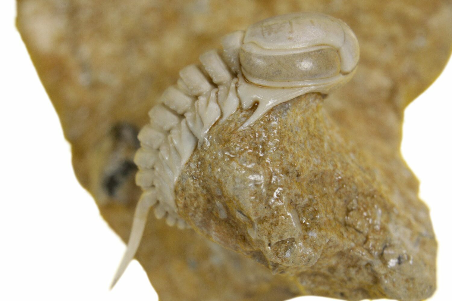 This is a rarely-offered Asaphid trilobite from the St. Petersburg region of Russia, Remopleurides nanus elongatus. This tiny trilobite features huge eyes and a single long axial spine. The ghostly white preservation is also quite unique and contrasts well against the brown limestone matrix. Including the spine, this diminutive bug is about .52" long. A serious treat for the trilobite species collector.