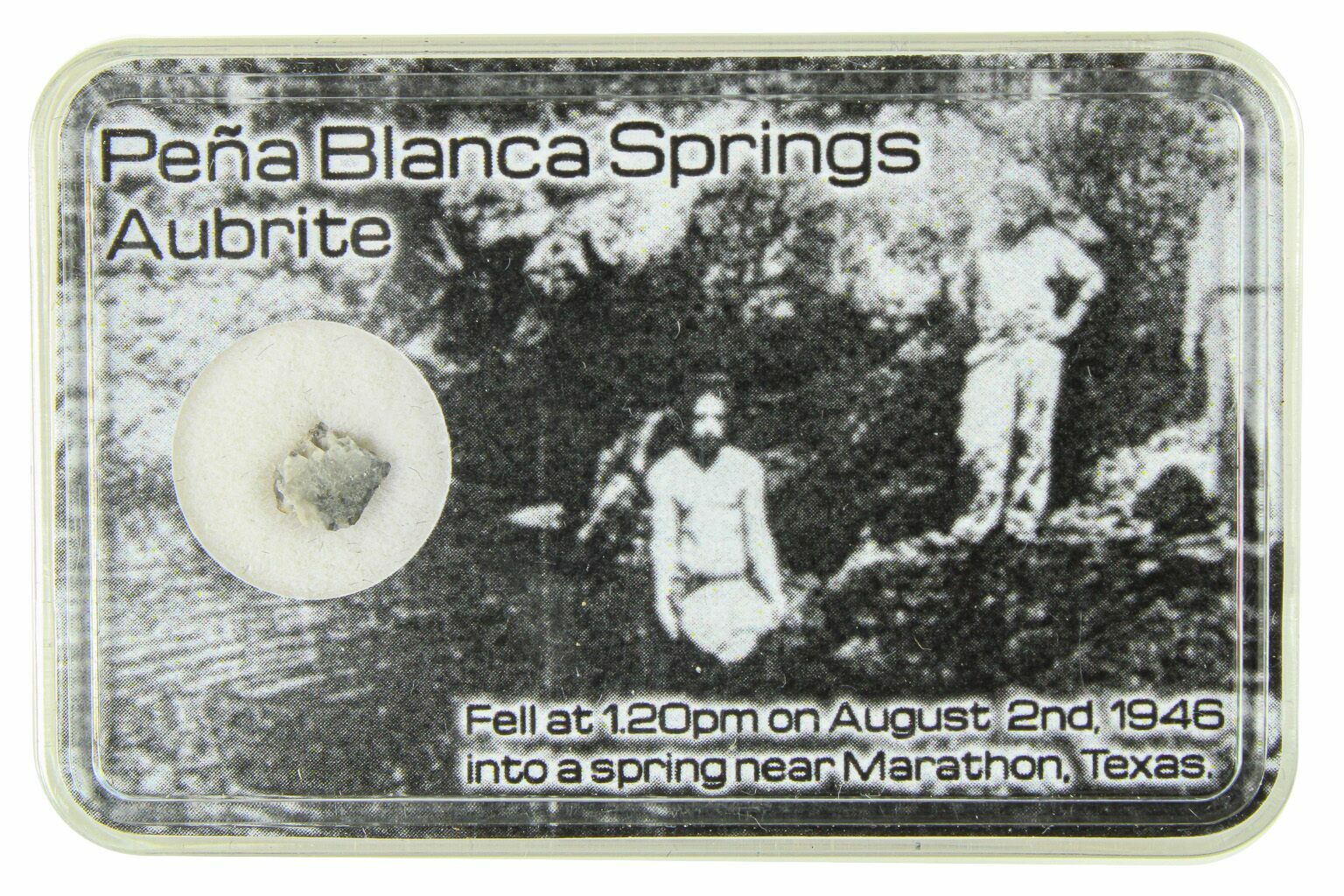 The Peña Blanca Springs meteorite is an aubrite that fell near the town of Marathon in western Texas on August 2, 1946. It landed in the middle of a swimming pond at the headquarters of the historic Gage Ranch! Approximately 70 kilograms were recovered, mostly as two large stones.