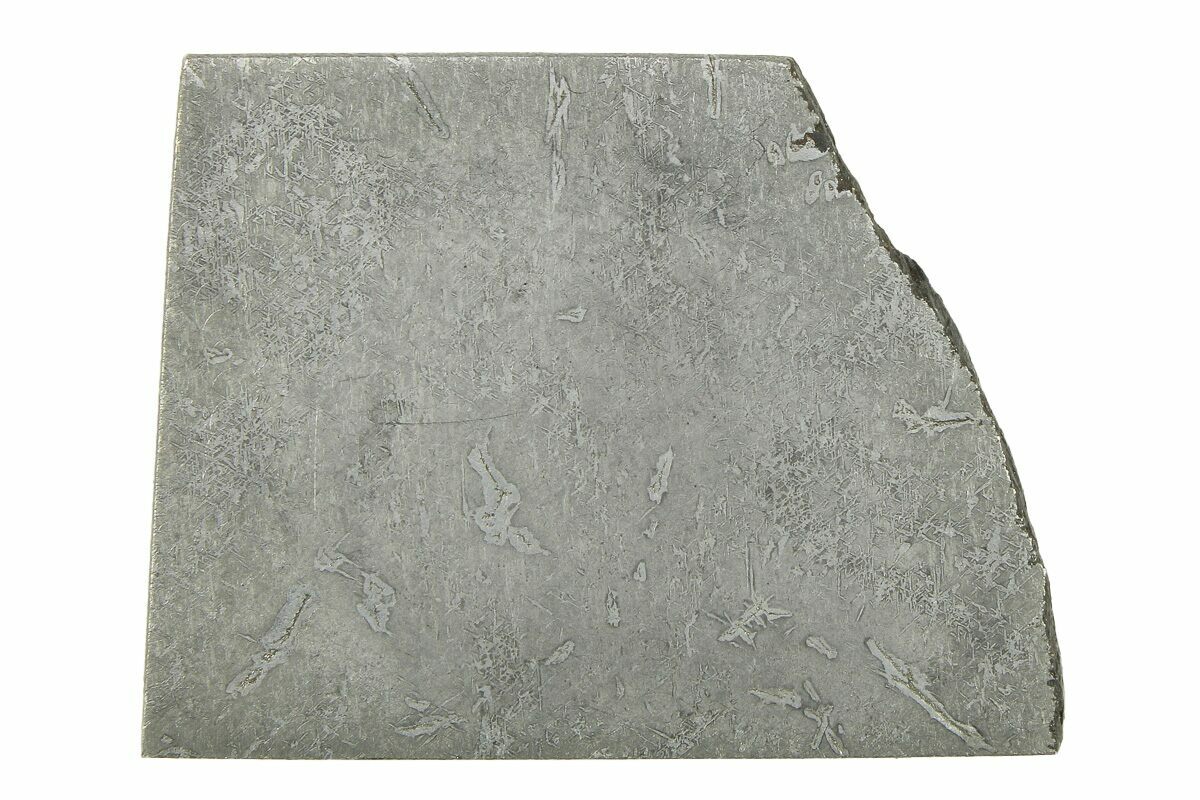 Most iron meteorites have distinctive, geometric patterns called Widmanstätten patterns, which become visible when the meteorite is cut and acid etched. These patterns are criss-crossing bands of the iron-nickel alloys kamacite and taenite that slowly crystalized as the core of the meteorites' parent bodies slowly cooled. Such large alloy crystallizations for mover millions of years and do not occur naturally on Earth, further proving that iron meteorites come from extraterrestrial bodies.