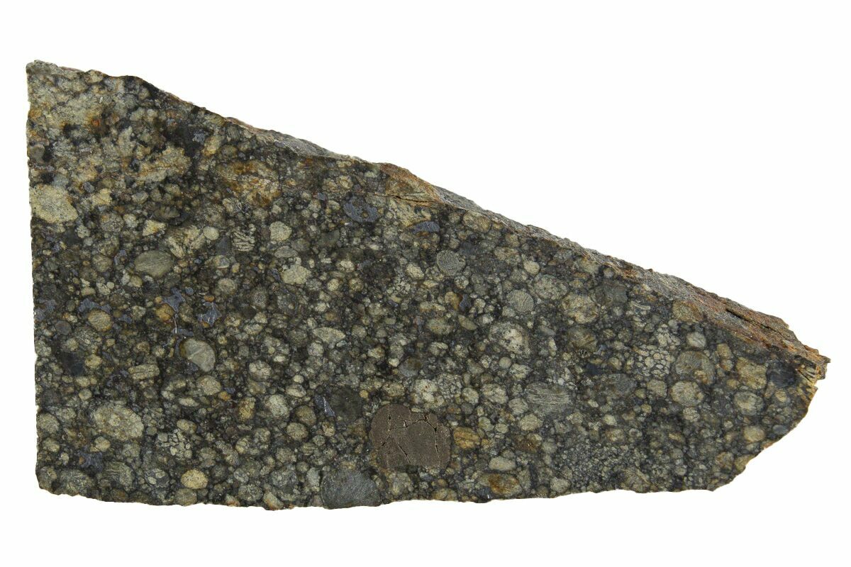 This is a 1.07" wide (2.62 gram) slice of the L3 chondrite Aba Panu. This is quite a recent witnessed fall: it exploded over the state of Oyo in Nigeria on April 19, 2018. It is a beautiful slice of the solar system's history, polished on one side to reveal its intricate interior details.