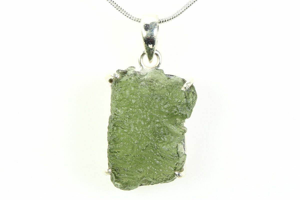 This is an authentic moldavite tektite specimen that was collected in the Czech Republic. The moldavite is displayed within a 925 silver pendant setting that allows you to take your favorite impactite on the go. When holding a light behind the pendant, the beautiful green coloration and translucency becomes apparent.
