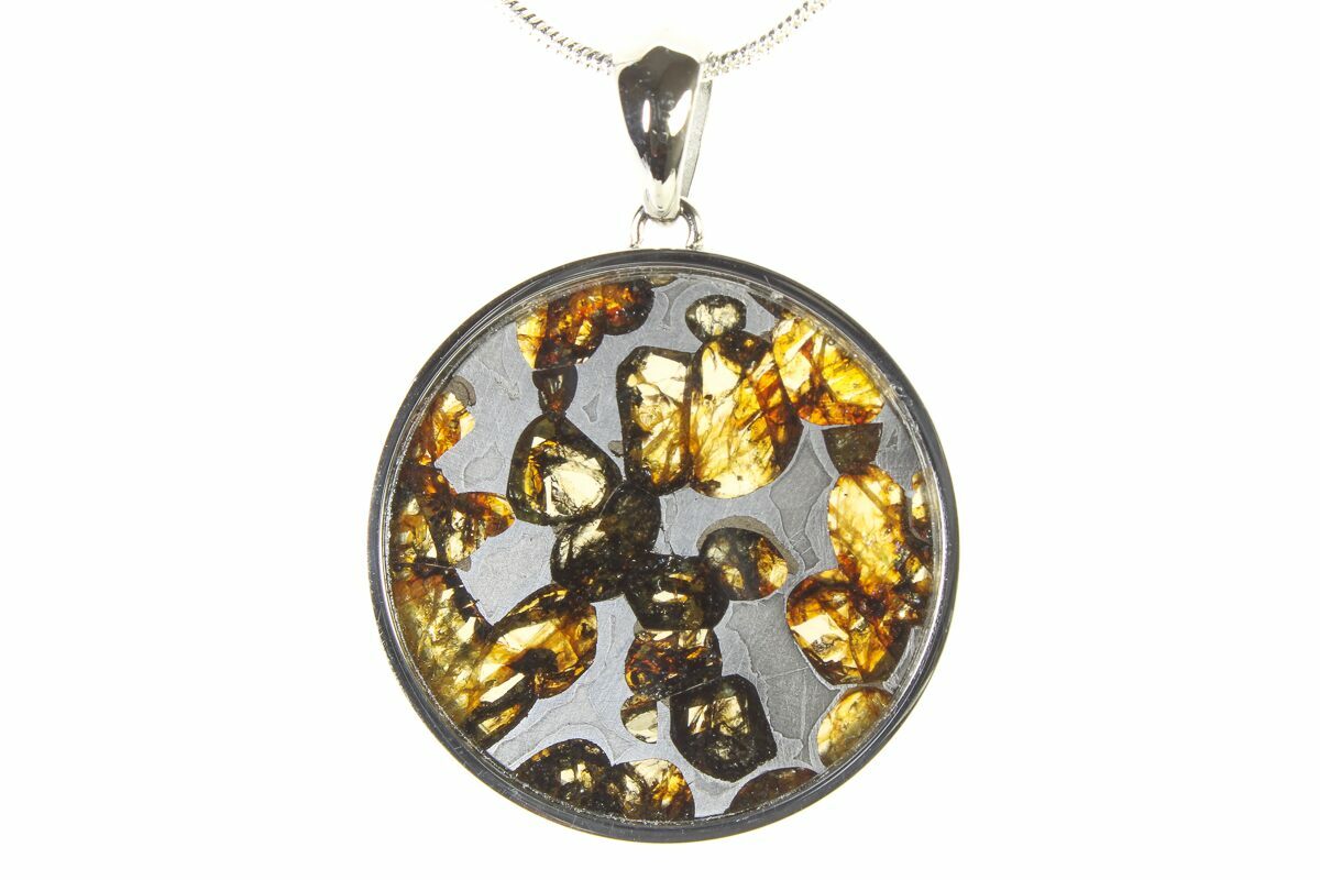 This is a 1.1" tall Sericho pallasite meteorite pendant with a .7" wide piece of polished meteorite. The meteorite is covered by a clear epoxy resin and has been set in a round stainless steel frame. It is accompanied by a 24" silver plated snake chain with a lobster clasp.