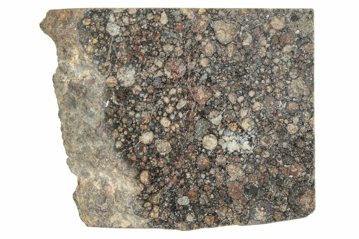 This is a 1.15" wide (5.6 gram) slice of the NWA 15662 ordinary chondrite meteorite. It has been polished on one side to highlight the densely packed grains.