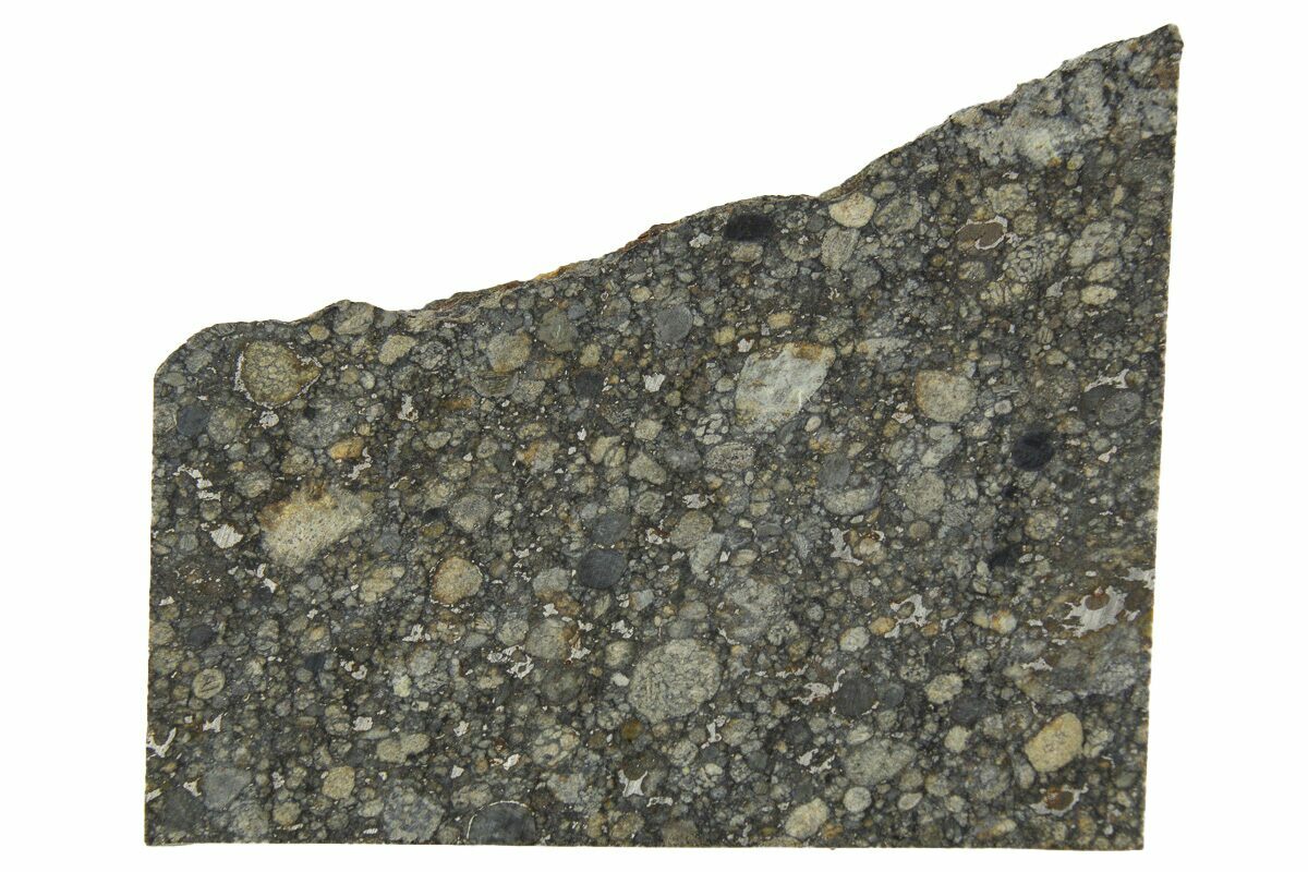 This is a 1.18" wide (5.49 gram) slice of the L3 chondrite Aba Panu. This is quite a recent witnessed fall: it exploded over the state of Oyo in Nigeria on April 19, 2018. It is a beautiful slice of the solar system's history, polished on one side to reveal its intricate interior details.