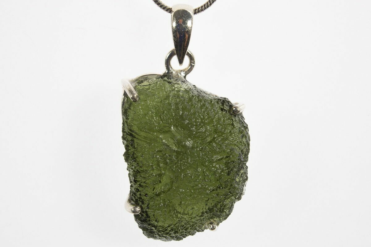 This is an authentic moldavite tektite specimen that was collected in the Czech Republic. The moldavite is displayed within a 925 silver pendant setting that allows you to take your favorite impactite on the go. When holding a light behind the pendant, the beautiful green coloration and translucency becomes apparent.