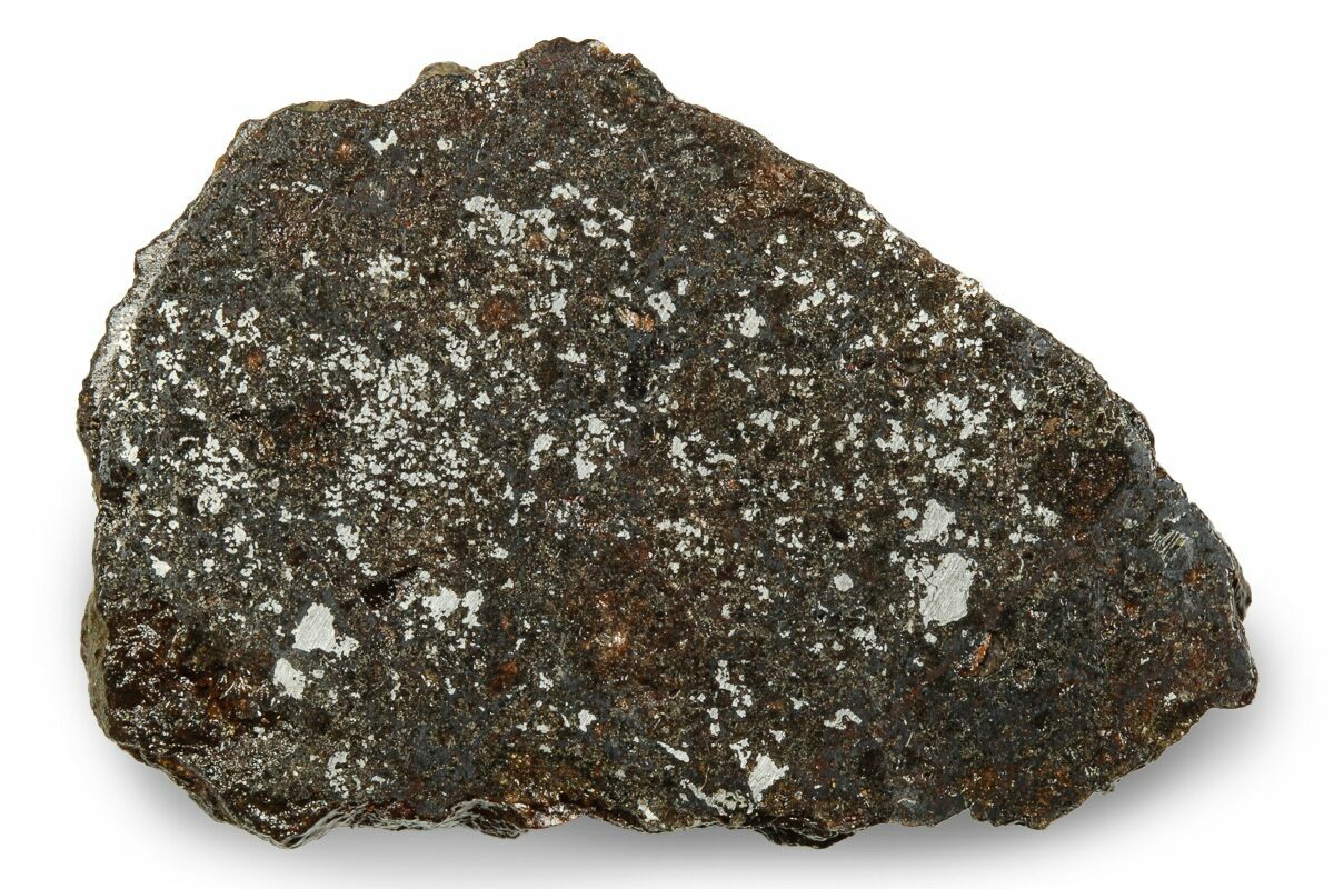 This is a 1.2" wide (11.3 gram) stony-iron mesosiderite meteorite section from the most recent discovery in the strewn field of Vaca Muerta, Chile. This piece has been cut flat and polished on one side revealing the inner metallic inclusions. The rest of the specimen has been left in its rough, natural state.