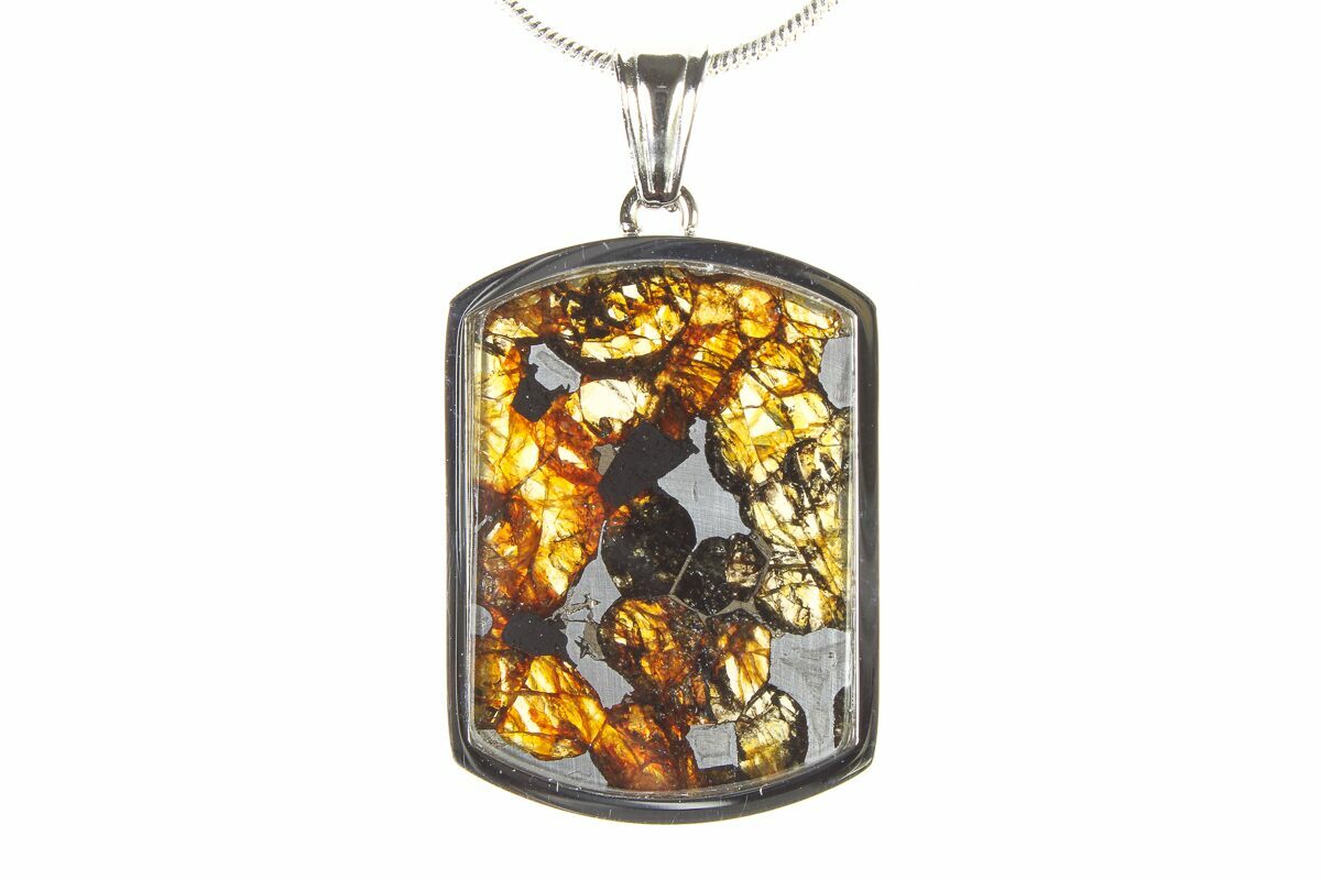This is a 1.2" tall (including loop) Sericho pallasite meteorite pendant with a .95" tall piece of polished meteorite. The meteorite is covered by a clear epoxy resin and has been set in a "dog tag" shaped, stainless steel frame. It is accompanied by a 24" long chain necklace.