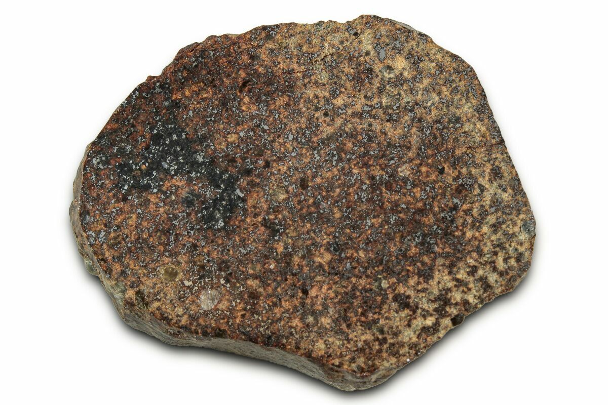 This is a 1.28" wide (11.11 gram) section of the chondrite meteorite NWA 869. Its surface is quite weathered, but a great deal of fusion crust can still be seen. The fragment has been cut and polished on one face to reveal the stunning interplay of multicolored chondrules and bright metal grains in its interior.