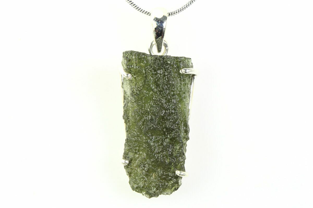 This is an authentic moldavite tektite specimen that was collected in the Czech Republic. The moldavite is displayed within a 925 silver pendant setting that allows you to take your favorite impactite on the go. When holding a light behind the pendant, the beautiful green coloration and translucency becomes apparent.
