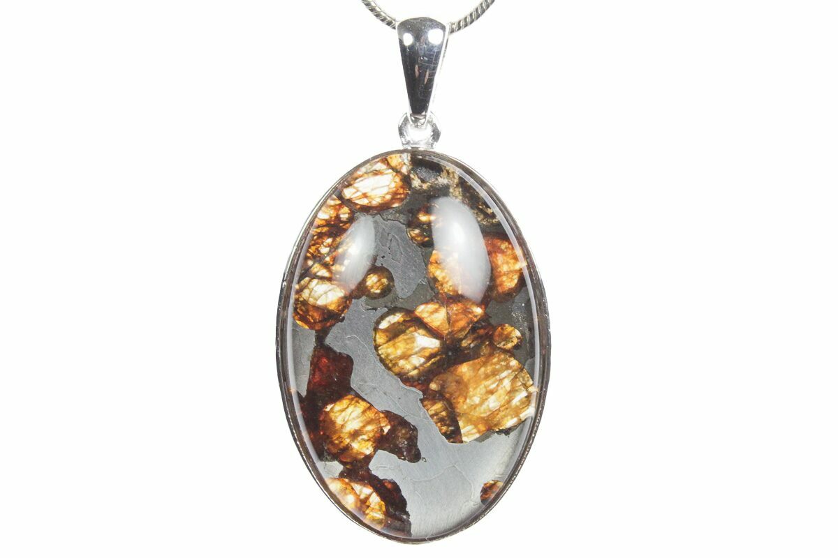 This is a 1.3" tall Sericho pallasite meteorite pendant. The meteorite slice is preserved in clear epoxy resin, beautifully showcasing its natural structure, and set within a sleek oval stainless steel frame. It comes ready to wear with a 24" silver-plated snake chain featuring a secure lobster clasp.