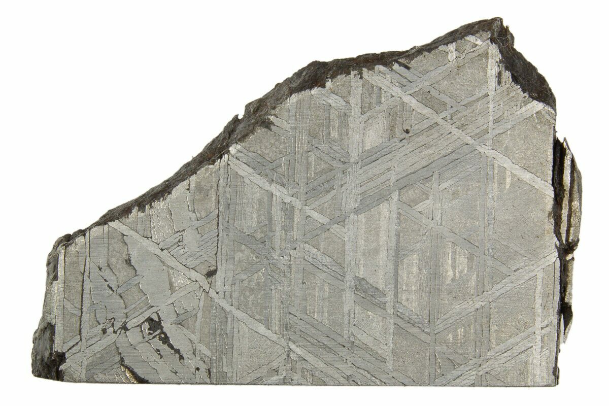 Most iron meteorites have distinctive, geometric patterns called Widmanstätten patterns, which become visible when the meteorite is cut and acid etched. These patterns are criss-crossing bands of the iron-nickel alloys kamacite and taenite that slowly crystalized as the core of the meteorites' parent bodies slowly cooled. Such large alloy crystallizations for mover millions of years and do not occur naturally on Earth, further proving that iron meteorites come from extraterrestrial bodies.