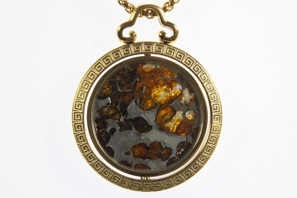 This is a stunning, 1.35" wide, round Sericho pallasite meteorite pendant in a rotating, gold plated frame. The meteorite slice covered by a clear epoxy resin to keep it stable and has been set in a round, gold plated, stainless steel frame that allows the center to rotate. It is accompanied by a 27" long chain.