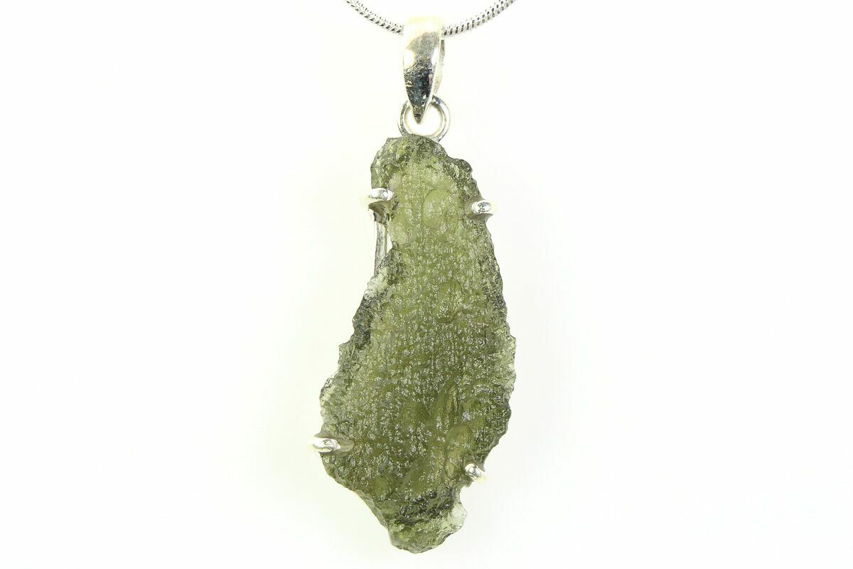 This is an authentic moldavite tektite specimen that was collected in the Czech Republic. The moldavite is displayed within a 925 silver pendant setting that allows you to take your favorite impactite on the go. When holding a light behind the pendant, the beautiful green coloration and translucency becomes apparent.