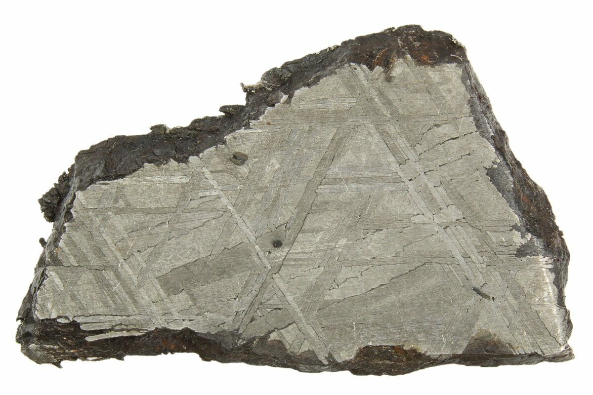 Most iron meteorites have distinctive, geometric patterns called Widmanstätten patterns, which become visible when the meteorite is cut and acid etched. These patterns are criss-crossing bands of the iron-nickel alloys kamacite and taenite that slowly crystalized as the core of the meteorites' parent bodies slowly cooled. Such large alloy crystallizations for mover millions of years and do not occur naturally on Earth, further proving that iron meteorites come from extraterrestrial bodies.