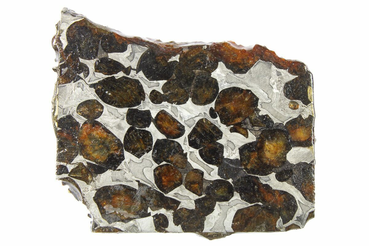 Sericho pallasite has rounded, gemmy olivine crystals varying in color from green to orange. Often its metal-rich areas show well-developed Widmanstätten patterns. They also have a particularly high olivine crystal density, as high as 70-80% in many specimens. It is quite attractive, particularly when sliced thin so light can pass through the olivine pockets: this makes it popular among collectors.