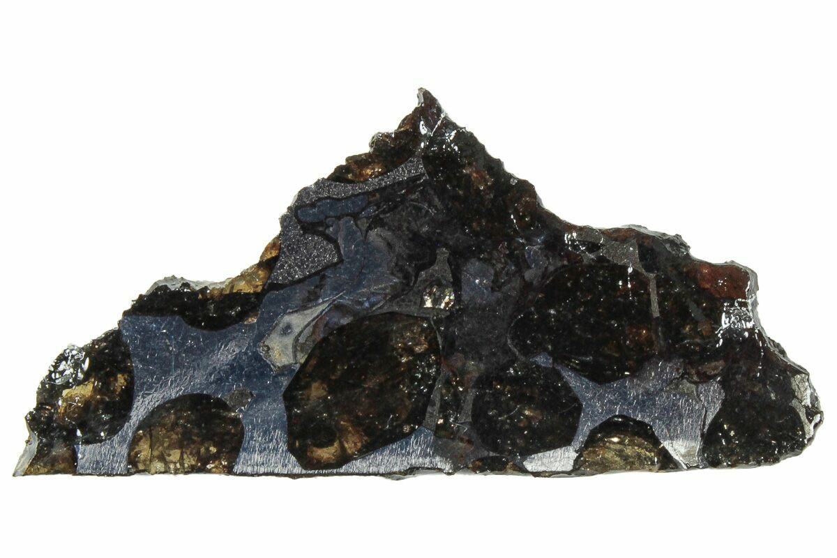 Sericho pallasite has rounded, gemmy olivine crystals varying in color from green to orange. Often its metal-rich areas show well-developed Widmanstätten patterns. They also have a particularly high olivine crystal density, as high as 70-80% in many specimens. It is quite attractive, particularly when sliced thin so light can pass through the olivine pockets: this makes it popular among collectors.