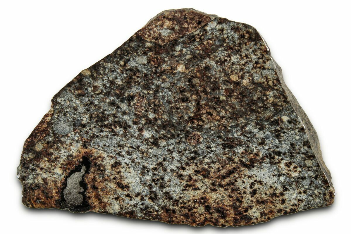 This is a 1.62" wide (27.10 gram) section of the chondrite meteorite NWA 869. Its surface is quite weathered, but a great deal of fusion crust can still be seen. The fragment has been cut and polished on one face to reveal the stunning interplay of multicolored chondrules and bright metal grains in its interior.