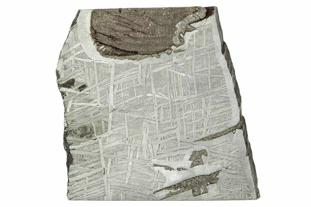 This is a 1.65" wide (25.12 grams) piece of the Saint-Aubin iron meteorite from Aube, France. It has been nicely cut into a thin slice and etched to display the complex Widmanstätten pattern.