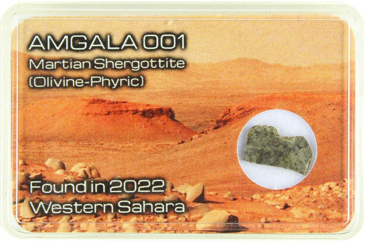 This is a .42" wide martian meteorite slice from the Amgala 001 fall. It comes in its own display case.