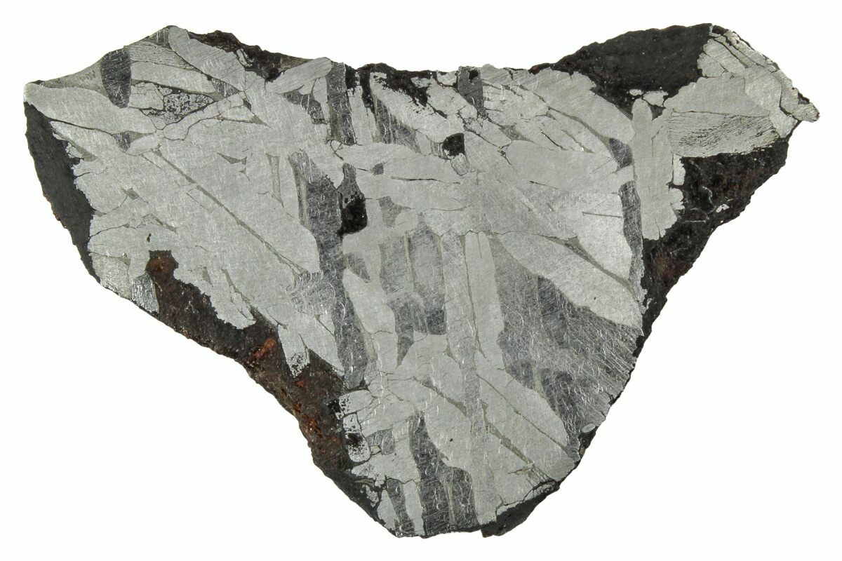 Most iron meteorites have distinctive, geometric patterns called Widmanstätten patterns, which become visible when the meteorite is cut and acid etched. These patterns are criss-crossing bands of the iron-nickel alloys kamacite and taenite that slowly crystalized as the core of the meteorites' parent bodies slowly cooled. Such large alloy crystallizations for mover millions of years and do not occur naturally on Earth, further proving that iron meteorites come from extraterrestrial bodies.