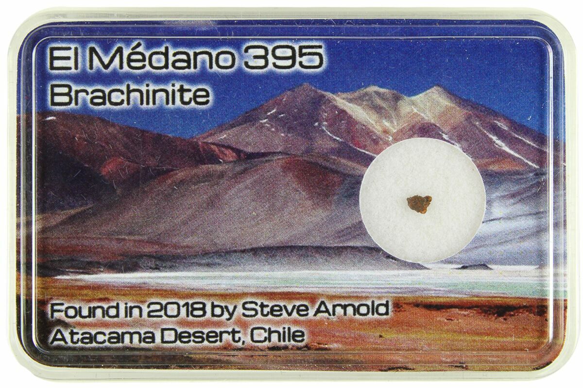 The specimen is a small part of a single, 2288-gram stone discovered by Steve Arnold in November 2018, near the top of a hill in Antofogasta, Chile. Despite looking very much like a ureilite meteorite, it turned out to be the western hemisphere's first recovered brachinite, a type of primitive achondrite. These extremely rare meteorites are composed almost entirely of olivine and little is known of their origins. Testing determined this El Médano (395) brachinite by volume is composed of 93% olivine, 5.5% diopside, 0.64% chromite, 0.57% plagioclase, 0.25% sulphide, and oxidized iron metal.