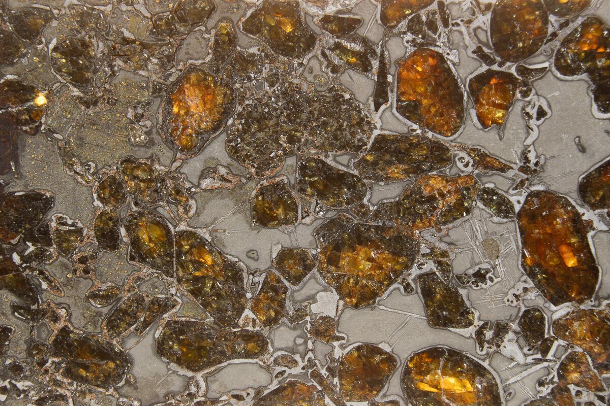 Pallasite meteorites consist of olivine (peridot) crystals surrounded by iron-nickel matrix. Upon acid etching, some pallasites display interweaving structures known as Widmanstätten patterns (or Thomson lines) in the metallic matrix. These structures are iron-nickel alloy crystals, typically kamacite and taenite, that cooled over millions of years in the vacuum of space.