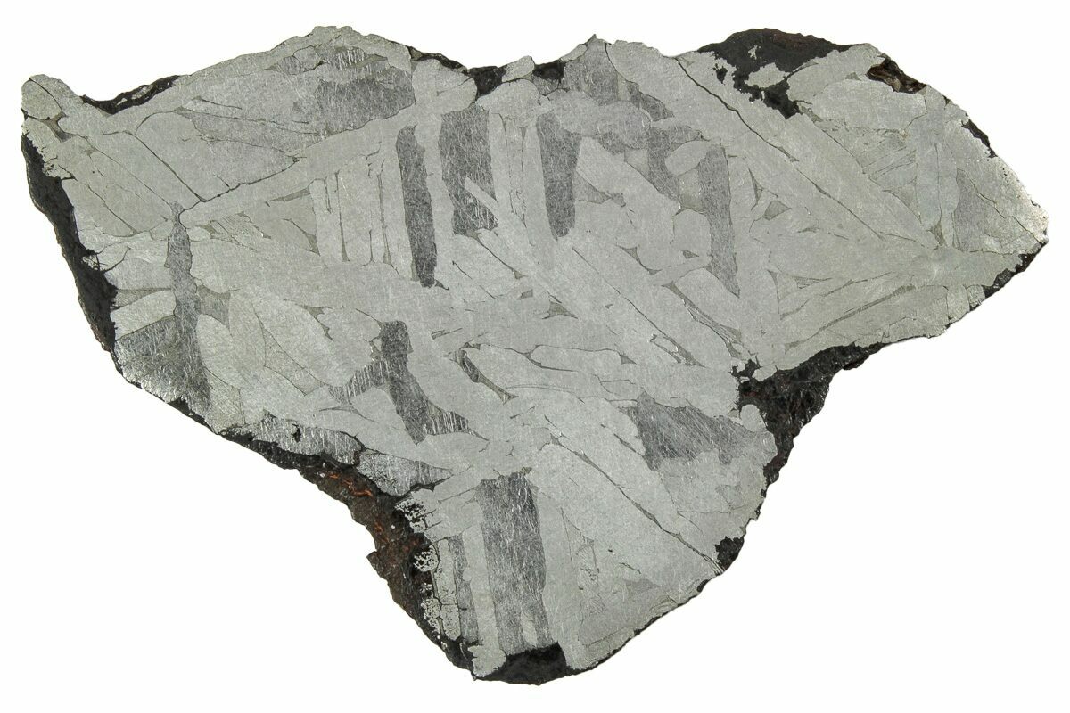 Most iron meteorites have distinctive, geometric patterns called Widmanstätten patterns, which become visible when the meteorite is cut and acid etched. These patterns are criss-crossing bands of the iron-nickel alloys kamacite and taenite that slowly crystalized as the core of the meteorites' parent bodies slowly cooled. Such large alloy crystallizations for mover millions of years and do not occur naturally on Earth, further proving that iron meteorites come from extraterrestrial bodies.