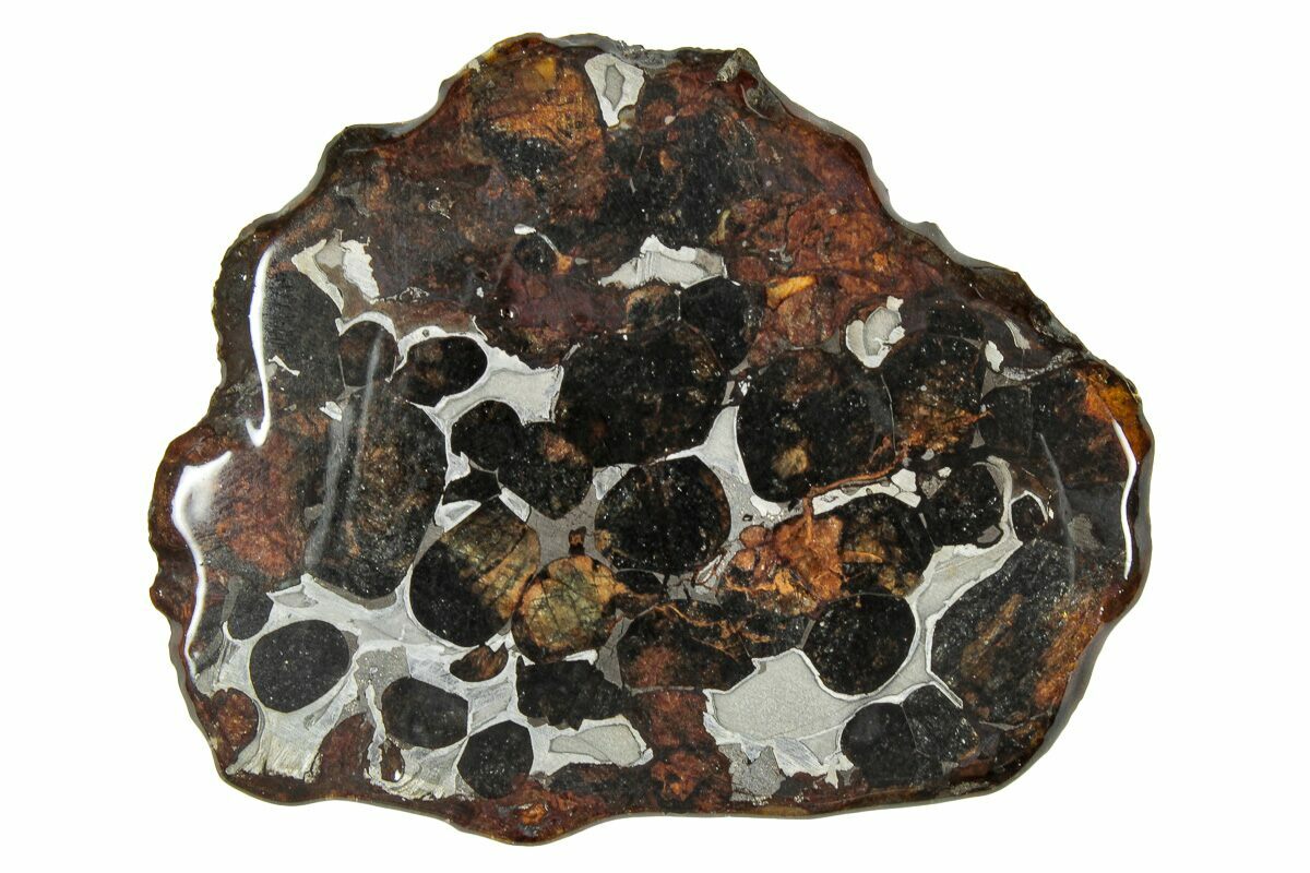 Sericho pallasite has rounded, gemmy olivine crystals varying in color from green to orange. Often its metal-rich areas show well-developed Widmanstätten patterns. They also have a particularly high olivine crystal density, as high as 70-80% in many specimens. It is quite attractive, particularly when sliced thin so light can pass through the olivine pockets: this makes it popular among collectors.