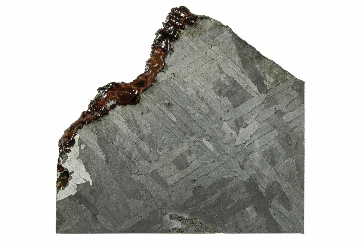 This is a 2.4" wide (58.1 grams) slice of the Seymchan pallasite meteorite from the Magadan district of Russia. It has been cut and etched to display the unique Widmanstätten pattern. A sealant has been applied to the surfaces to help prevent rusting. It comes with an acrylic display stand.
