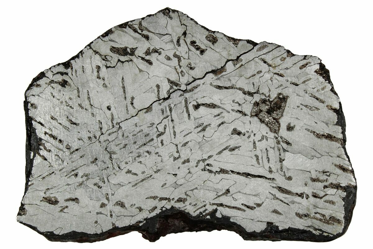 Most iron meteorites have distinctive, geometric patterns called Widmanstätten patterns, which become visible when the meteorite is cut and acid etched. These patterns are criss-crossing bands of the iron-nickel alloys kamacite and taenite that slowly crystalized as the core of the meteorites' parent bodies slowly cooled. Such large alloy crystallizations for mover millions of years and do not occur naturally on Earth, further proving that iron meteorites come from extraterrestrial bodies.